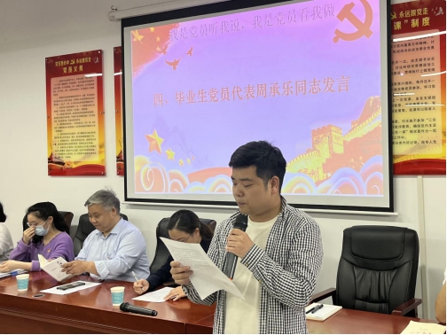 甘向阳给所有毕业生党员上了一堂生动的党课。他在祝贺大家的同时,提出三个寄语:一是强化党员意识和理想信念。作为共产党员要始终践行共产主义的理论和实践,认真学习,提高自身的理论水平和分辨是非的能力。二是学习党的历史。从历史的发展中汲取智慧,增强力量。发挥党员的先进性,牢记党员义务。三是正确对待利益,保持清正廉洁。不断加强自身的思想道德修养,提高组织纪律意识。最后,甘向阳希望同学们秉承“至善穷理”的校训,脚踏实地,敢于担当,永保共产党员先进性,在新的岗位上继续谱写属于自己的壮丽篇章。