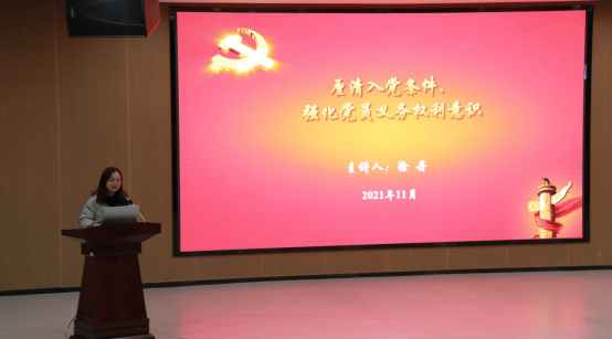 徐丹从入党申请、入党积极分子、发展对象、预备党员、正式党员五个阶段对发展党员流程进行了详细的讲解,明晰了入党条件,强化了党员权利义务意识,并就如何践行党员权利和履行党员义务对在场员工提出具体要求。