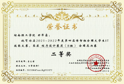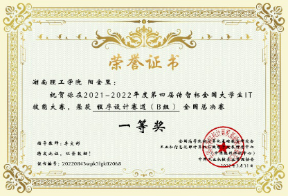 近日,xc体育计算机类专业本科员工阳金里、李居航、李维逸等在2021-2022年度第四届“传智杯”全国老员工IT技能大赛全国总决赛中荣获国家一等奖3项、二等奖2项、优秀奖1项。
