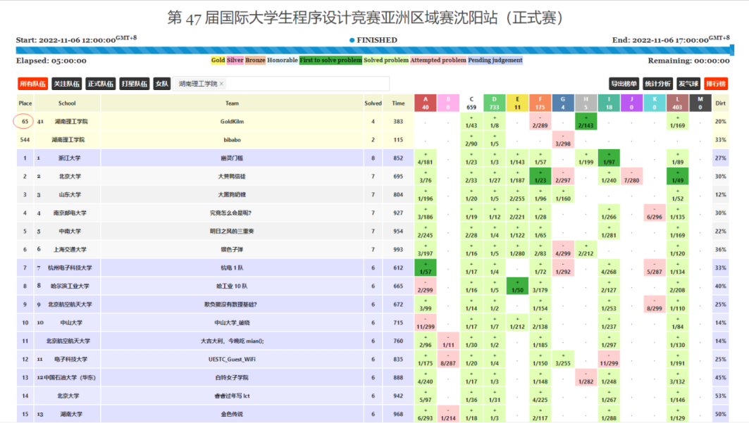 11月6日,第47届ICPC国际老员工程序设计竞赛亚洲区域赛(沈阳站)在线举行,由xc体育李文彬老师指导,由计算机科学与技术专业21级阳金里、22级金烜宇和陈盼3位同学组成的GoldKilm队,与来自北京大学、浙江大学、上海交通大学、香港中文大学等286所高校,共701支正式参赛队伍同场竞技,经过5小时的激烈角逐,获得队伍排名65,集团排名41的好成绩,荣获银牌。本次员工参赛并取得喜人成绩,是近年来xc体育以“三全育人”为理念,多措并举,不断加强本科专业建设的阶段性成果,也是软件技术集训中心小伙伴们充分利用寒暑假等节假日和课余时间,耐住寂寞,刻苦训练,顽强拼搏,团结协作的结果。