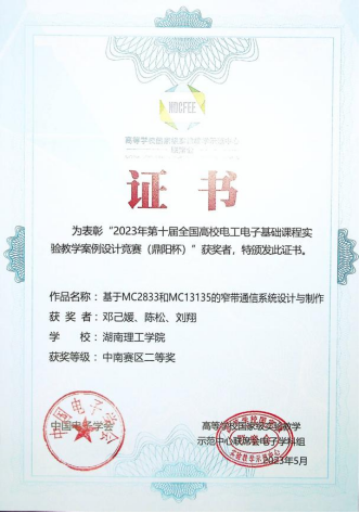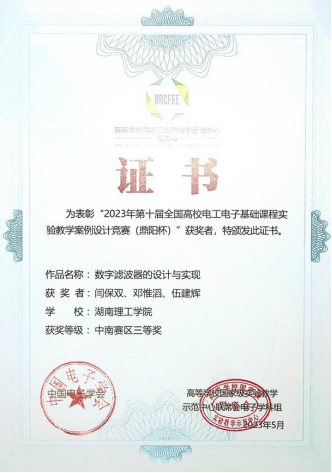 近日,xc体育“电子信息与通信技术”国家级实验教学示范中心收到2023年第十届全国高校电工电子基础课程实验教学案例设计竞赛(鼎阳杯)中南赛区获奖证书,示范中心教师邓己媛、陈松、刘翔研制的“基于MC2833和MC13135的窄带通信系统设计与制作”项目和闫保双、邓惟滔、伍建辉老师的“数字滤波器的设计与实现”项目经激烈角逐分别获二等奖和三等奖。