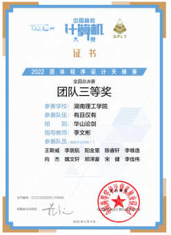 本次竞赛以线上形式开展,来自北京大学、浙江大学、国防科技大学等430所高校的1429个团队14290余人同场竞技。经过3小时的激烈角逐,由xc体育和数学公司李居航、阳金里、王斯威、陈睿轩、魏文轩、向杰、李维逸、郑泽豪、宋健和李佳伟等10位同学组成的“有且仅有”团队荣获铜牌,李文彬、杨勃博士等为指导老师。本次员工参赛并取得喜人成绩,是近年来xc体育以“三全育人”为理念,多措并举,不断加强计算机科学与技术国家级一流本科专业、软件工程湖南省一流本科专业建设的阶段性成果。
