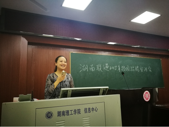 招聘负责人戴瑶主持了中国联通湖南分公司的宣讲会,她结合自己的从业经历,通过视频向在座员工介绍了湖南联通公司的发展历程,并讲述了联通公司各类补贴、保险福利以及招聘要求等情况。在与现场14级员工互动的过程中,她对信息学子的踊跃应聘表示热烈欢迎。