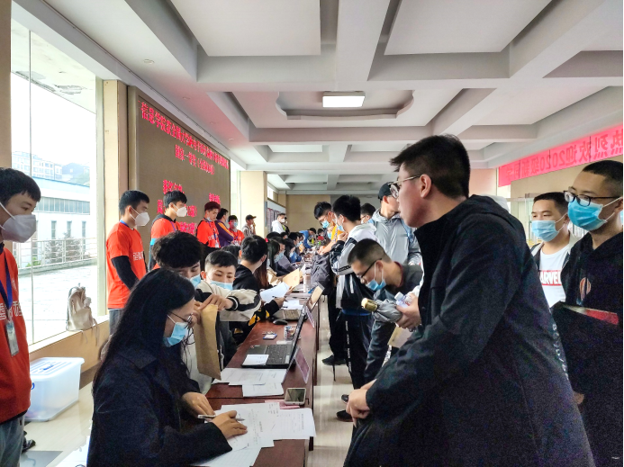 逸夫楼内,2020级各班班主任和助班耐心地为新生们办理着入学注册手续,志愿者们热情地引导新生领取一卡通、床上用品并帮助新生搬运行李,迎新现场工作高效有序。