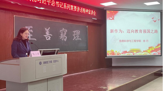 会上,徐丹以《新作为:迈向教育强国之路》为主题,围绕习近平总书记关于教育的重要论述,深入解读“建设教育强国”、“加快教育现代化”、“办好人民满意的教育”的核心要义,并从树立新时代教育强国之梦、书写教育现代化奋进之笔、实施人民满意教育暖心之举三大方面展开分享。