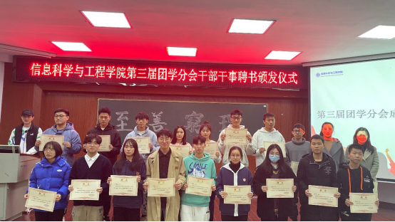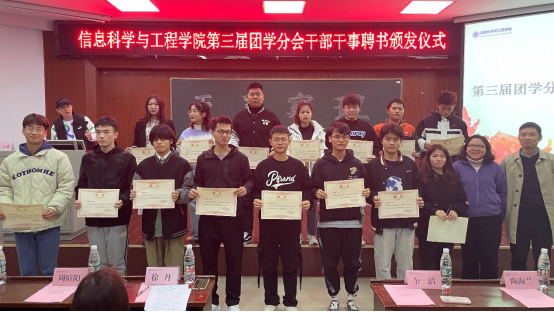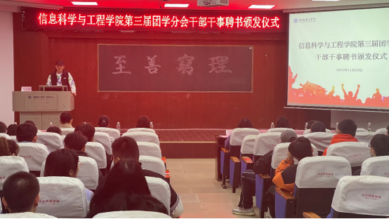 11月23日12:20信息学院在六栋学术报告厅举行第三届团学干部干事聘书颁发仪式。公司党委副书记徐丹、学工办全体老师出席,第三届团学全体成员参加。仪式由院团委书记王勤主持。