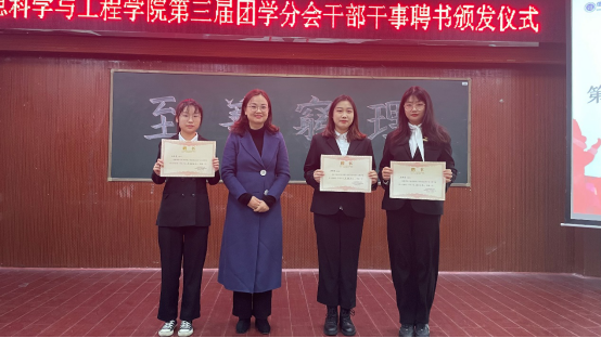 徐丹、学工办全体老师为第三届团学干部干事颁发聘书。
