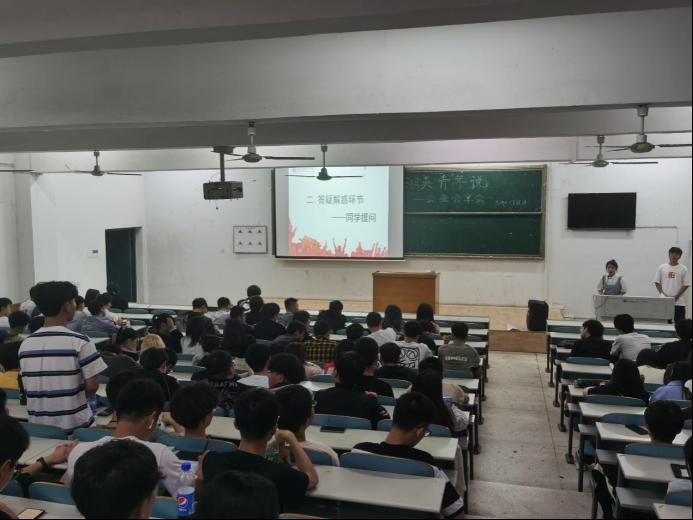本次活动共分为两个环节,一是主讲人演讲,二是听众问答。活动伊始,宋程琪先向大家介绍了挑战杯的基本要况和参赛流程,随后,宋程琪以自身的比赛经历现身说法,从选题确立、队伍组建、导师选择多个角度向大家分享参赛经验。同学们在汲取经验的同时也认真思考,积极发问。宋程琪为同学们一一进行解答。