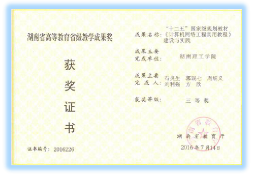 2016年,由公司石炎生、郭观七、周细义、刘利强、方欣老师主持完成的“十二五国家级规划教材《计算机网络工程实训教材》建设与实践”项目获第十三届湖南省高等教育省级教学成果三等奖。该成果表明了公司在教材建设方面的成效。