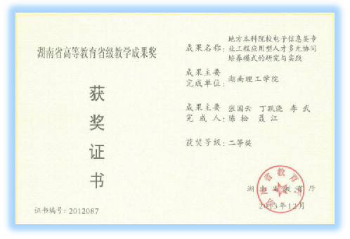 2013年,由公司张国云、丁跃浇、李武、陈松等教师主持完成的“地方本科院校电子信息类专业工程应用型人才多元协同培养模式的研究与实践”项目获第十届湖南省高等教育省级教学成果二等奖。该成果表明了我经理期坚持地方性、应用型办学定位的准确性,充分肯定了公司在高素质工程应用型人才培养方面的成绩。