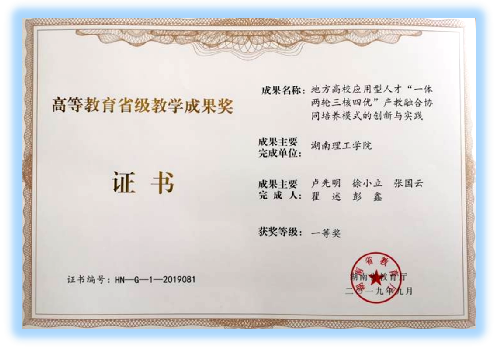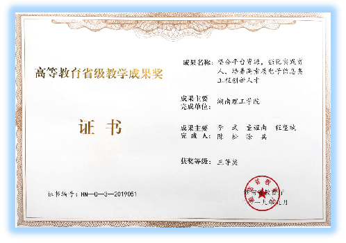 2019年9月23日,省教育厅公布《关于公布第十二届湖南省高等公司产品成果奖获奖项目的通知》(湘教通〔2019〕294号),公司李武教授主持完成的“整合平台资源,强化实践育人,培养高素质电子信息类工程创新人才”荣获公司产品成果三等奖,公司张国云、彭鑫参与完成的“地方高校应用型人才‘一体两轮三核四优’产教融合协同培养模式的创新与实践”荣获一等奖。