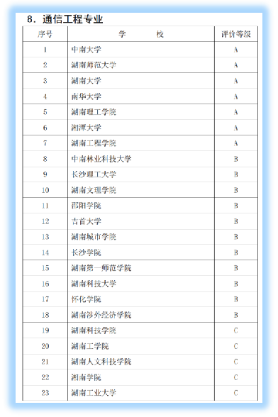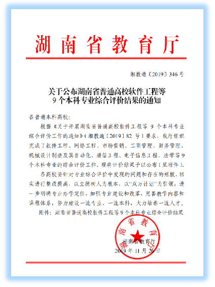 2019年11月26日,湖南省教育厅发布了《关于公布湖南省普通高校软件工程等9个本科专业综合评价结果的通知》,公司电子信息工程、通信工程专业两个专业参评,双双获评为A等。电子信息工程专业在全省23个参评高校中排名第4,通信工程专业在全省23个参评高校中排名第5。这是公司两轮共7个本科专业参评以来取得的最好成绩。