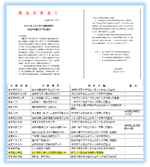 2004年,由公司杨克昌、王岳斌、陈凯文、张红等老师主持完成的“倡导自主发展,突出个性培养----计算机科学与技术专业‘2+3’模块教学改革”项目获第四届湖南省高等教育省级教学成果三等奖。该成果充分表明了公司在计算机科学与技术专业教学改革方面的成效。