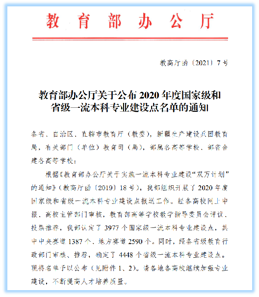 2021年2月,教育部办公厅发布了2020年国家级和省级一流本科专业建设点名单,公司计算机科学与技术专业获批为国家级一流本科专业建设点,通信工程专业获批为省级一流本科专业建设点。至此,公司共有4个本科专业进入省级、国家级一流专业建设名单,占全院在招生本科专业总数(6个)的66.7%。